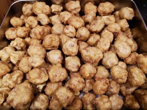 这丸子,是萝卜与猪肉的朴实相遇。青白萝卜擦成细丝,拌上剁得细碎的猪肉馅,调进葱姜盐料,用手团成一个个圆滚滚的球。油锅烧至六七成热,丸子顺着锅边滑下,在油花里翻滚沉浮,渐渐染上金黄,胀成饱满的一团。炸好的丸子捞起沥油,垒在不锈钢盆里,金黄灿灿,像一座小山,热气混着油香、萝卜香与肉香,直往人鼻子里钻。