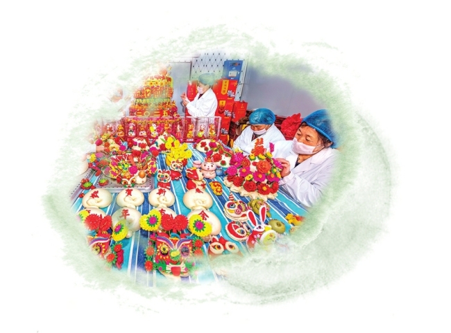 在万荣县解云仙花馍店里,民间艺人正在捏制独具晋南特色、栩栩如生的面塑花馍。薛俊摄