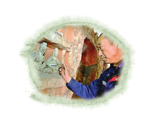 云冈研究院工作人员在云冈石窟第1窟修复塑像。山西日报记者刘通摄