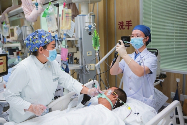 中国医学科学院肿瘤医院山西医院着力建设研究型病房,让更多患者享有国家区域医疗中心建设成果。图为重症监护室医护人员为患者进行床旁支气管镜检查。山西日报记者秦洋摄