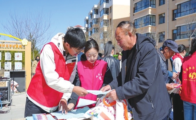 和顺县工作人员向易地搬迁小区居民发放移风易俗宣传品及资料。
