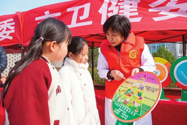 3月5日,临汾市2026年“3·5”学雷锋纪念日主题活动暨“爱临汾·赢未来”志愿服务系列活动在平阳广场启动。图为志愿者正在科普健康饮食知识。