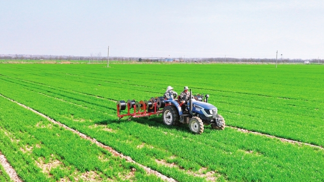 3月20日,永济市黄河滩万亩麦田,农户抢抓农时,有序开展滴灌设施铺设工作,为返青麦苗精准供水。